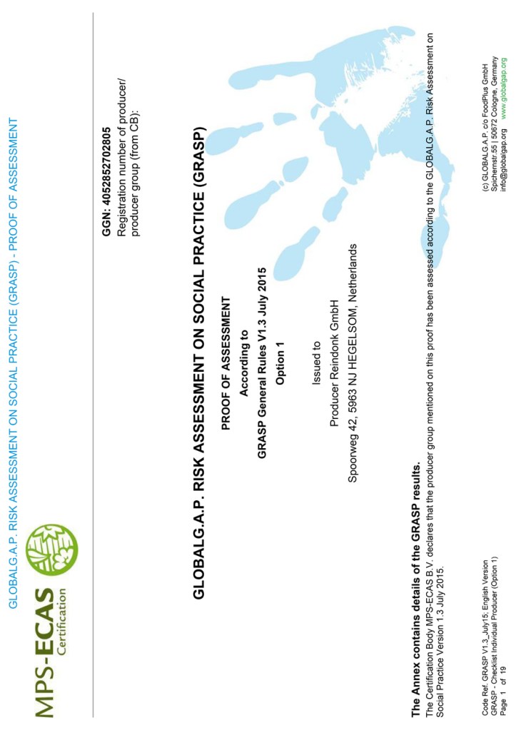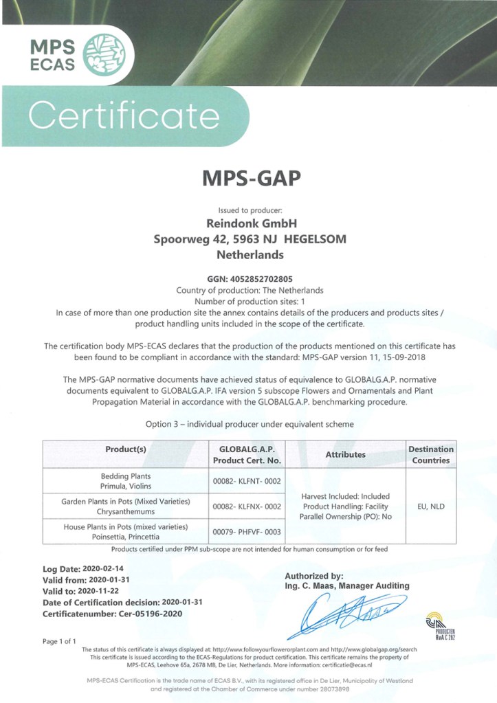 In order to present ourselves as a sustainable company, we are certified in various areas: environmental certifications (MPS A, on the way to planet proof ) and social certifications (MPS GAP, SQ and Global GAP and Grasp ), Fair Trade Poinsettia (support for cutting production companies in Africa) To this end, various audits are conducted every year. ( The certificates of these are below to find.)